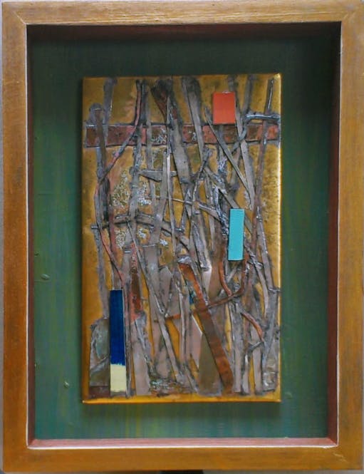 Szkic wykonany na blasze mosiężnej .Elementy metalowe połączone zostały lutem cynowym "na gorąco".Płaszczyzny koloru -akryl na drewnie.Praca wykonana na zmówienie w Warszawie.